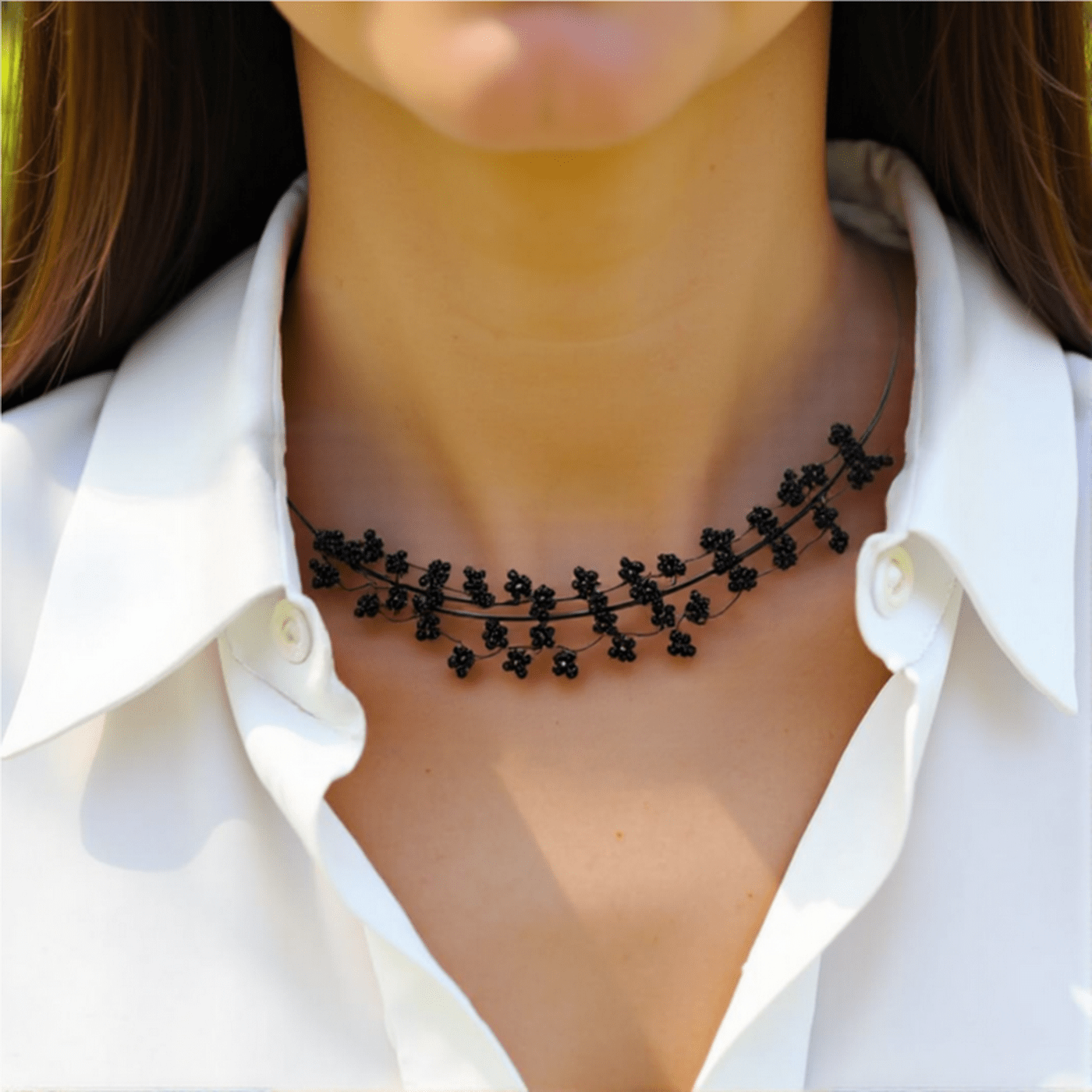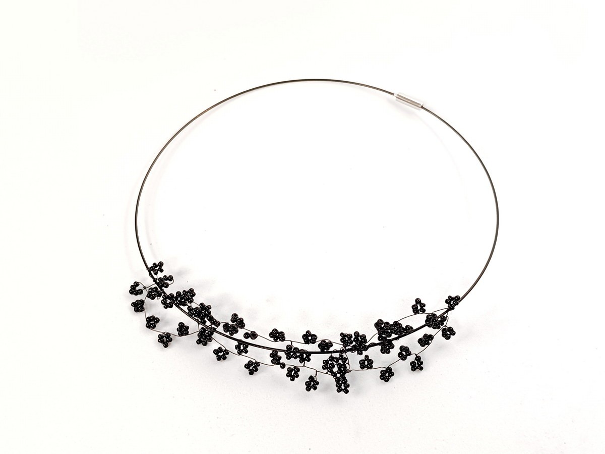 Iz žice, z drobnimi japonskimi perlami, ki nežno odbijajo svetlobo, je ta ogrlica lahkotna kot dih in udobna za celodnevno nošenje.