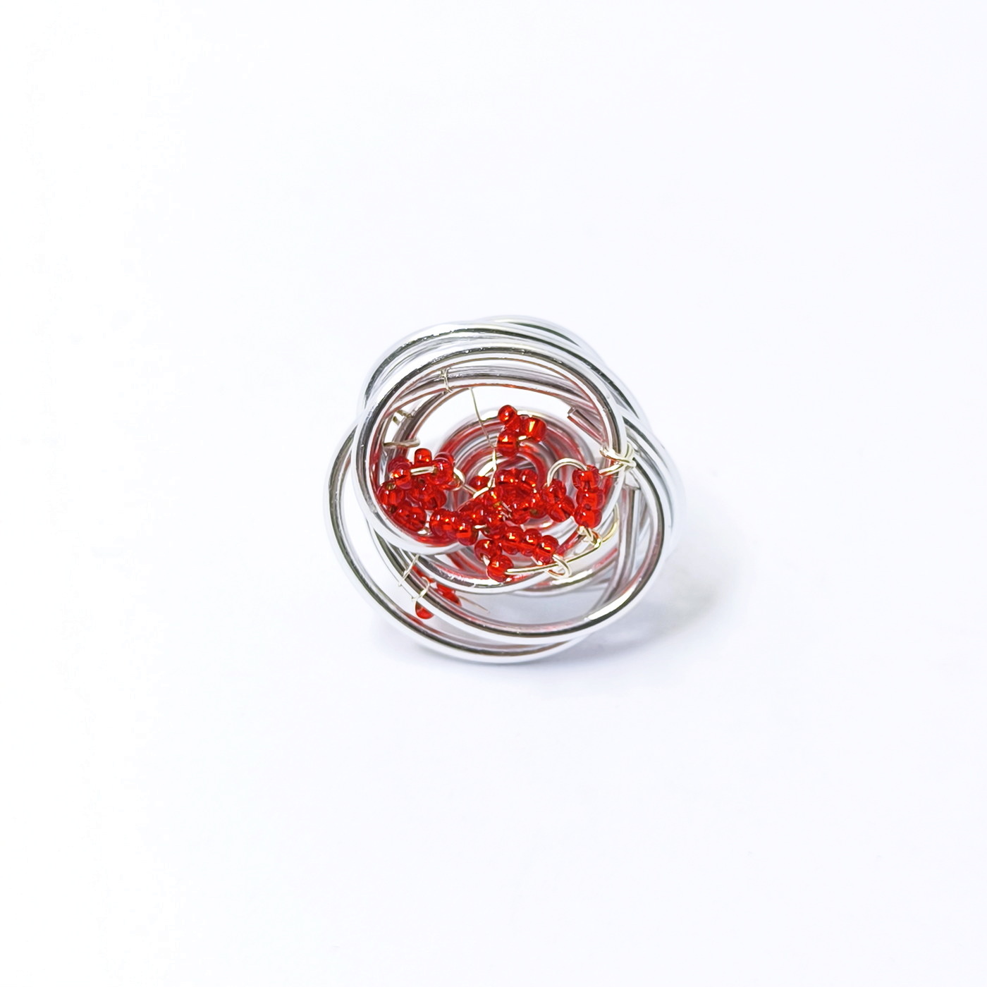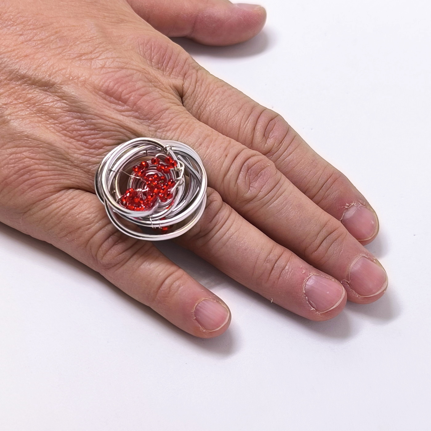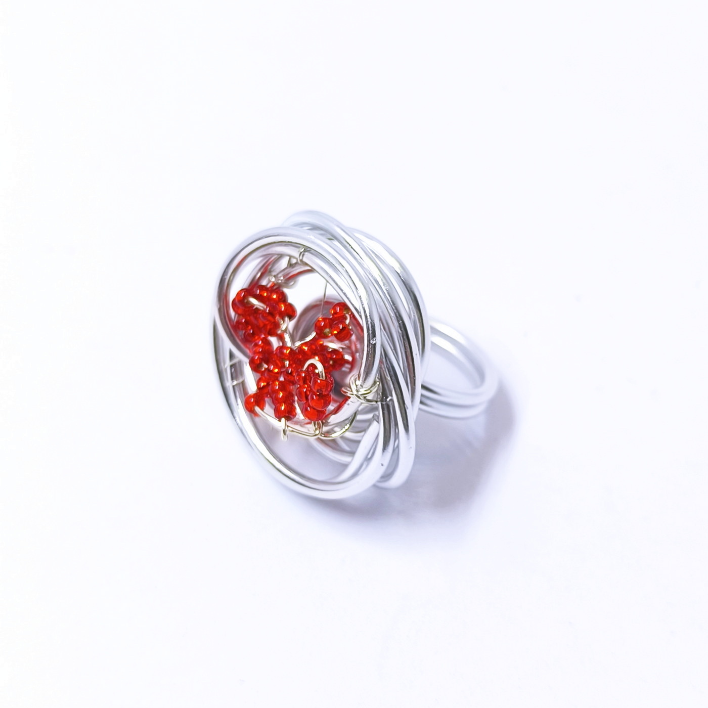 Oznake: aluminijasti prstan, eleganten prstan, Frida, prstan z rdečimi perlami, ročno izdelan nakit, srebrn prstan, Stina prstan, unikatni prstan