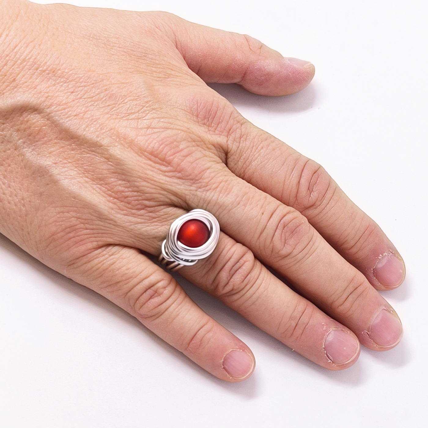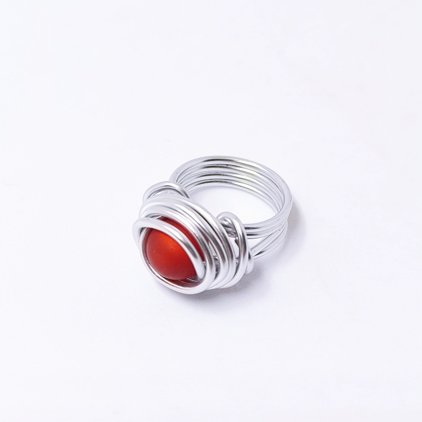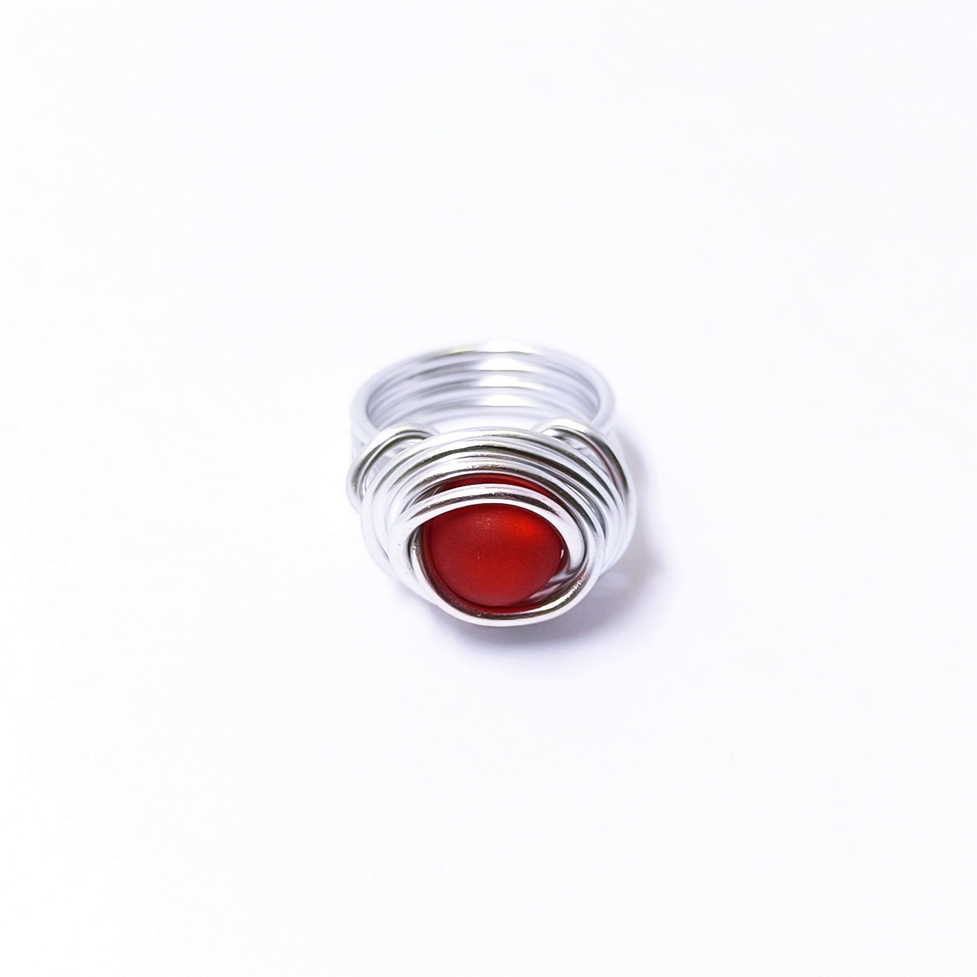 Oznake: aluminijasti prstan, Greta, minimalističen prstan, prstan z rdečo perlo, ročno izdelan nakit, srebrn prstan, Stina prstan, unikatni prstan
