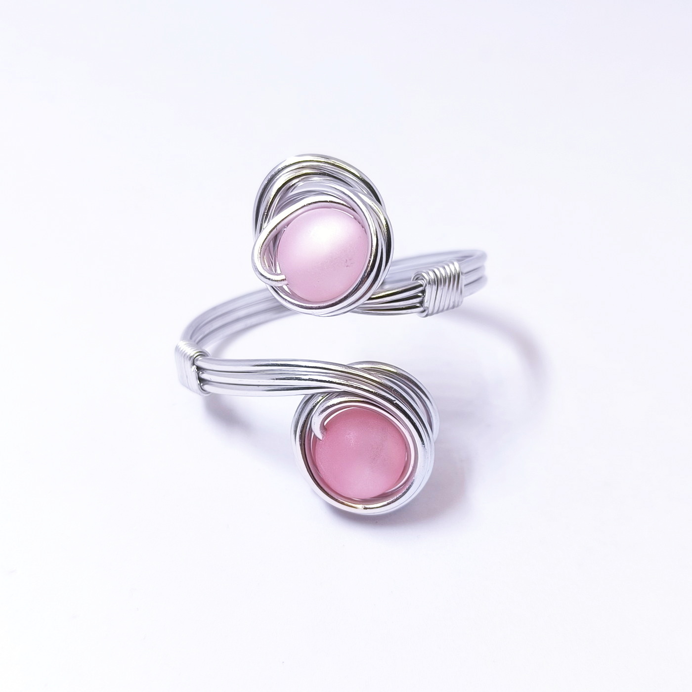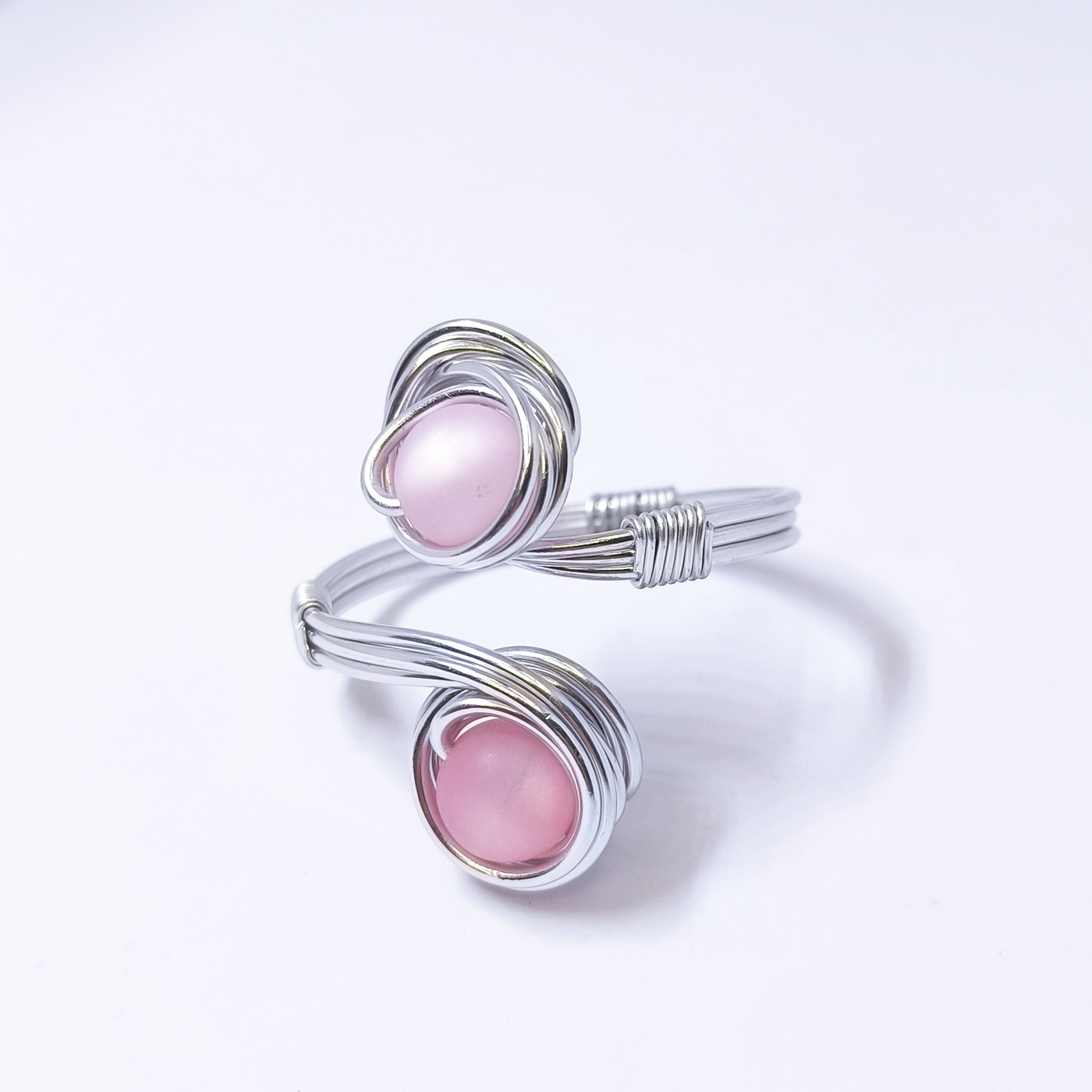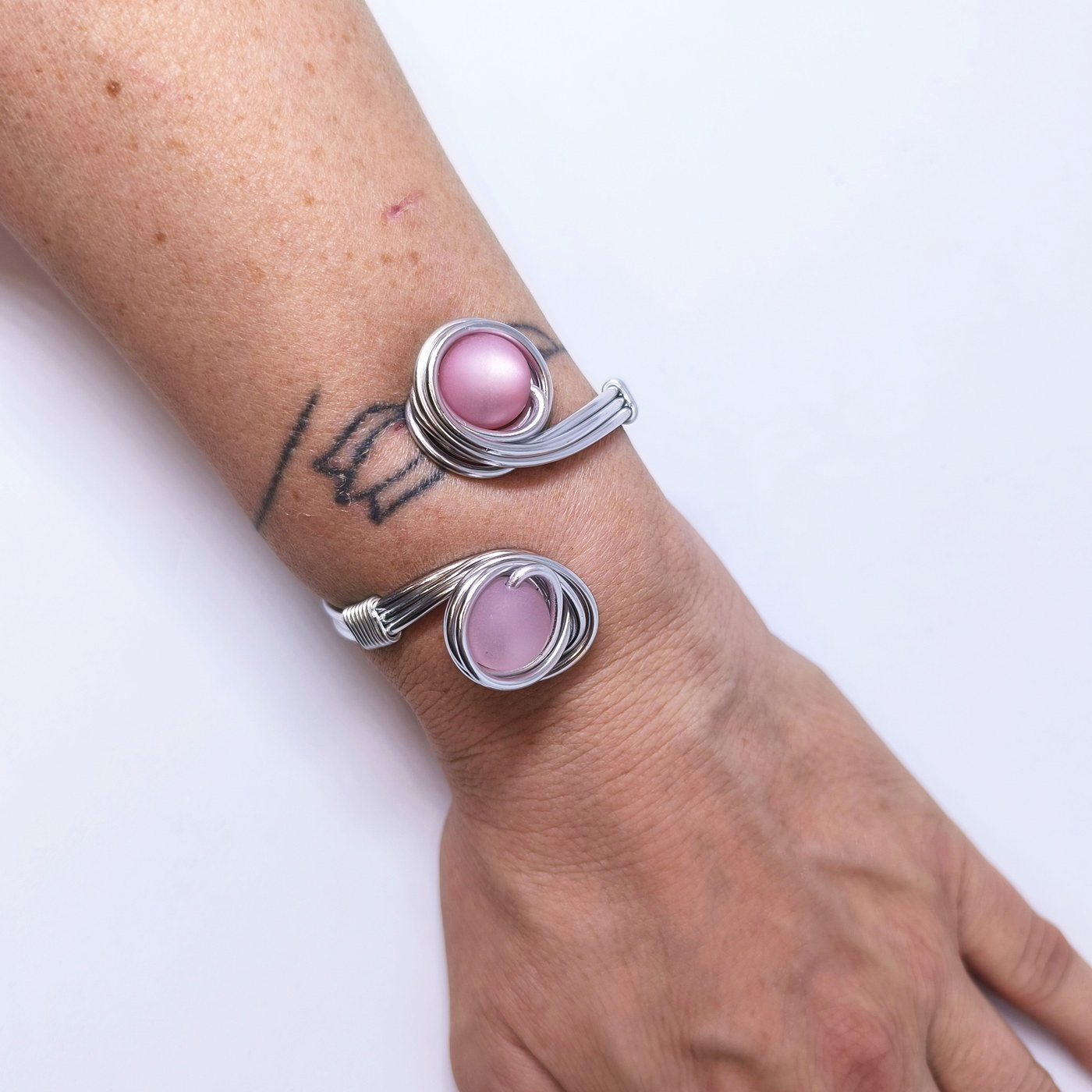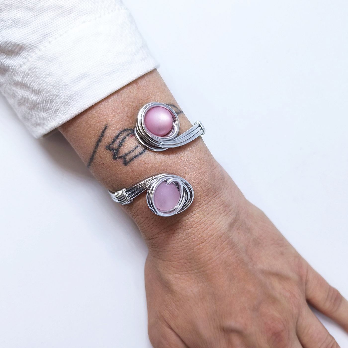 Ročno oblikovana iz lahkotne aluminijaste žice, ki je hipoalergena in ne potemni, se z ovitimi linijami nežno prilagodi zapestju. Dve perli, ujeti v elegantno spiralno obliko, simbolizirata ravnotežje med močjo in nežnostjo.